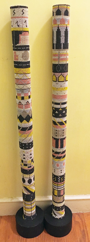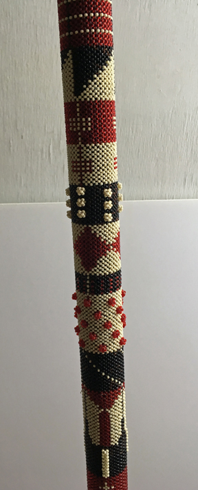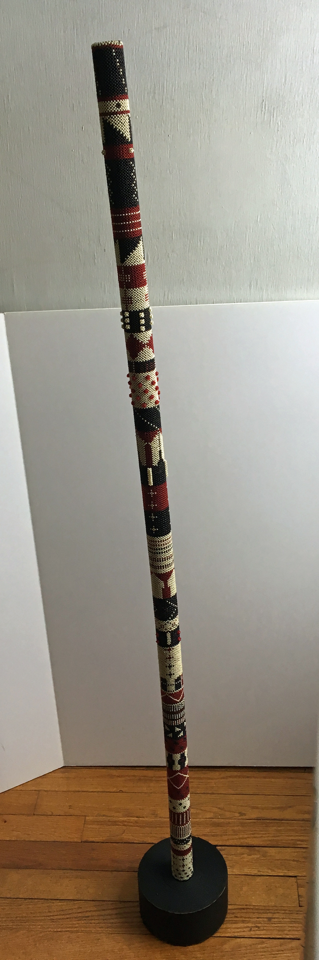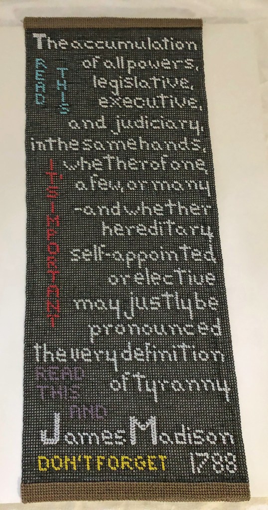 I was drawn to make art though the fiber arts, and wound up in love with beadwork which I discovered in 1995. At first, I made jewelry with beads. But then I learned stitches which could be used to make statements with words and images and could even build objects as well as creating textiles. The political situation in our country at that time – the 1990’s and since then, provided me with much inspiration. Some excellent books were also written during the 1990’s and early in the 21st century and I think I have every one.