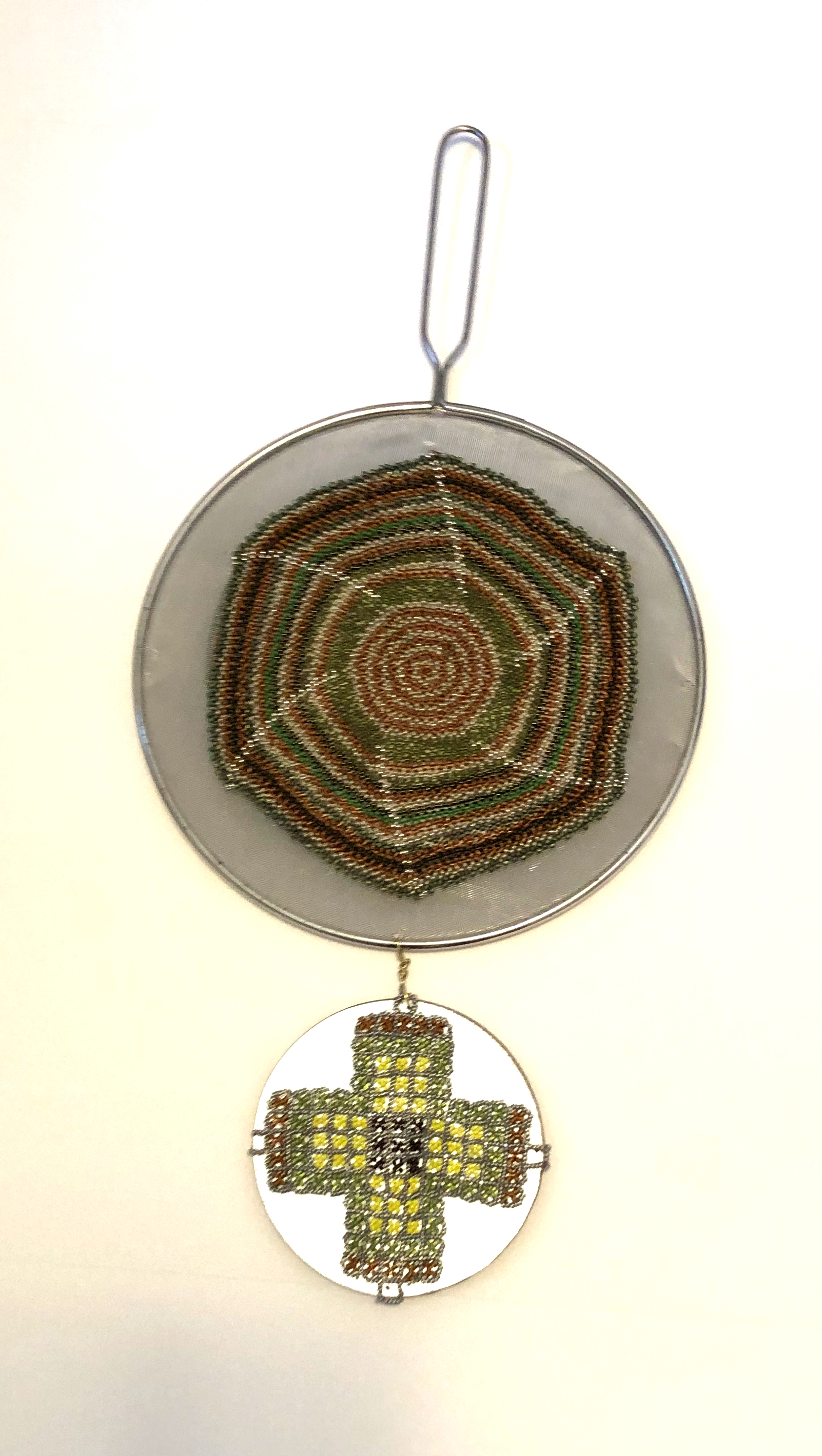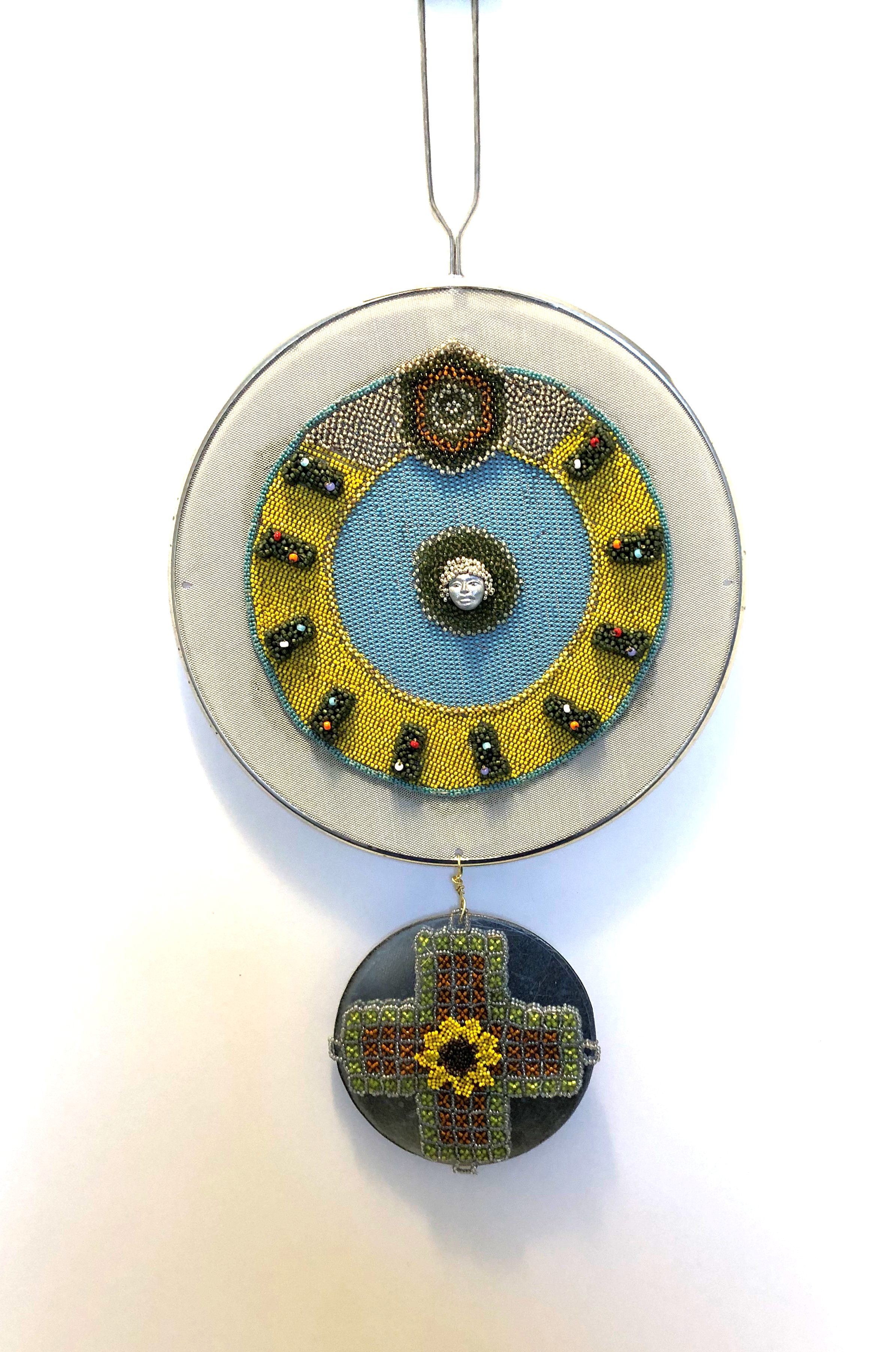 glass beads, metal disc and metal spatter shield, nylon beading thread.