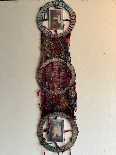 steel rings, yarn spun from recycled silk saris, photographs on vellum, acrylic frames, silver mylar tape, wire